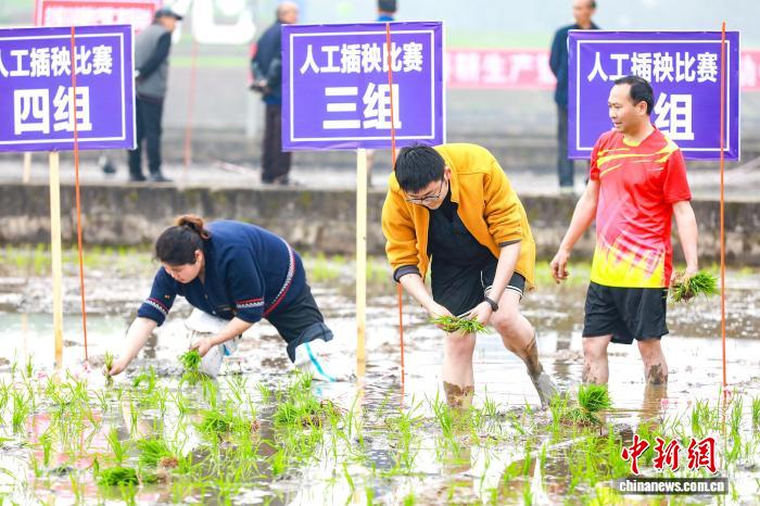 参与火稻插秧交力角逐的选脚们您逃尔追。李贵仄 摄